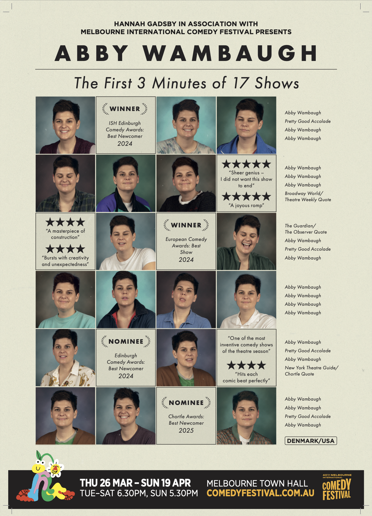 Fresh off a four-week NYC Off-Broadway run produced by Jenney Shamash (Hannah Gadsby: Douglas, Something Special, WOOF!), Mike & Carlee Productions (Broadway’s Oh, Mary!) and Ally Engelberg (The Other Two, Just For Us), and sell out runs in LA, London and Edinburgh, Abby Wambaugh brings her critically acclaimed, award-winning show to Melbourne for the first time. Don’t miss it!!
